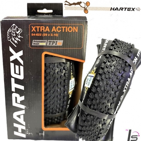 Marca: Hartex. Modelo: Xtra Action. Kevlar. Taco chico. Medida: 29 x 2.10 (54-622). 60 TPI. Hasta 65 PSI Producto: Importado. Made in India. Peso: 800 g. Cada caja contiene 1 cubierta.